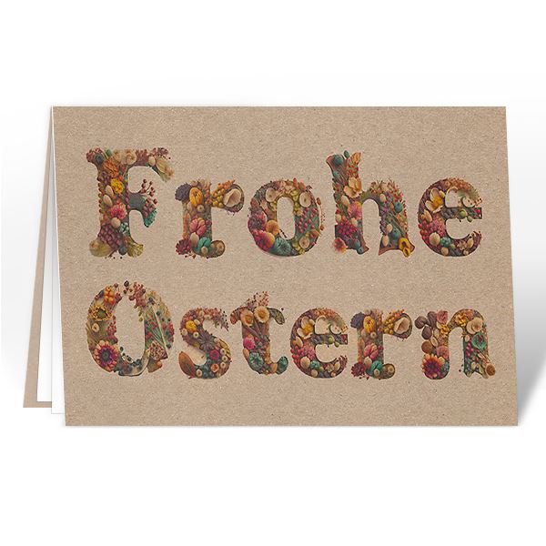 Format A5 quer, Recyclingpapier in Muskatbraun, inkl. weissem Einlageblatt und Standard-Couvert weiss. Die Osterkarte zeigt den Schriftzug "Frohe Ostern" in großen, dekorativen Buchstaben. Die Buchstaben sind mit bunten Ostereiern, Blumen und anderen österlichen Motiven gefüllt. Der Hintergrund der Karte ist beige und hat eine leicht strukturierte Oberfläche. Die Karte ist aufrecht stehend abgebildet, sodass der Schriftzug gut lesbar ist. Eine fröhliche und einladende Karte, perfekt für die Osterzeit!