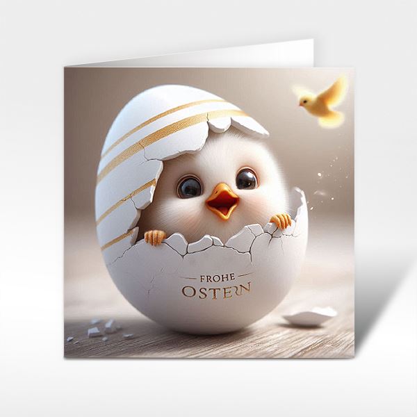 Format 15 x 15 cm, inkl. Standard-Couvert weiss. - Die Osterkarte zeigt ein grosses, weisses Ei mit goldenen Streifen, das auf einer Holzoberfläche steht. Das Ei ist an mehreren Stellen aufgebrochen, und aus den Rissen schaut ein kleines gelbes Küken heraus. Über dem Ei fliegt ein kleiner gelber Vogel. Auf dem Ei steht der Text "FROHE OSTERN". Es ist eine sehr kreative und niedliche Karte, die die fröhliche Stimmung von Ostern perfekt einfängt!
