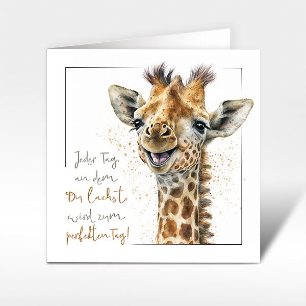 Format 15 x 15 cm, inkl. Standard-Couvert weiss. – Die Glückwunschkarte zeigt eine lachende Giraffe in der Mitte. Links neben der Giraffe steht der Text: "Jeder Tag, an dem Du lachst, wird zum perfekten Tag!" Die Karte hat einen weissen Hintergrund und die Giraffe ist detailliert und farbenfroh gezeichnet.