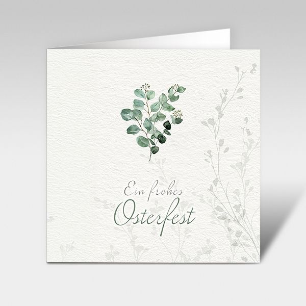 Format 15 x 15 cm, inkl. Standard-Couvert weiss. Diese Osterkarte vereint schlichte Eleganz mit einem natürlichen Frühlingsgefühl. Das feine Aquarellmotiv mit zarten Blättern und Blüten wirkt modern und warm zugleich. Der zurückhaltende Schriftzug «Ein frohes Osterfest» passt perfekt zur hochwertigen, leicht strukturierten Kartenoberfläche. Ideal für persönliche Ostergrüsse oder stilvolle Geschäftspost.